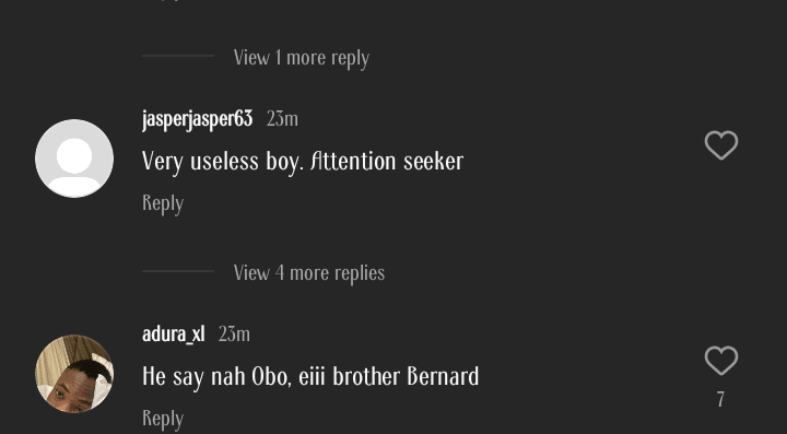 Reacting to the video, @jasperjasper63 stated: “very useless boy, Attention seeker”