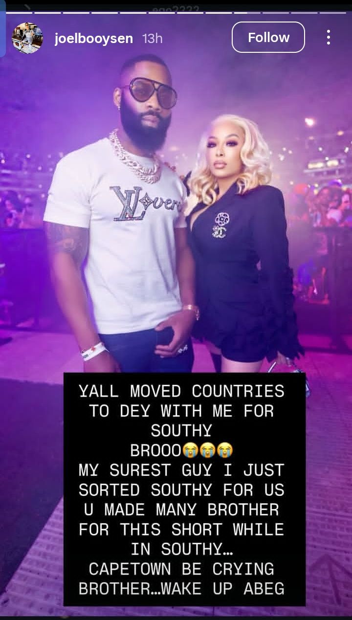 ”You all moved countries to dey with me for Southy. My surest guy , I just sorted Southy for us.You made Many brother for this short while in Southy. Capetown be crying. Brother wake up abeg”, The post reads.