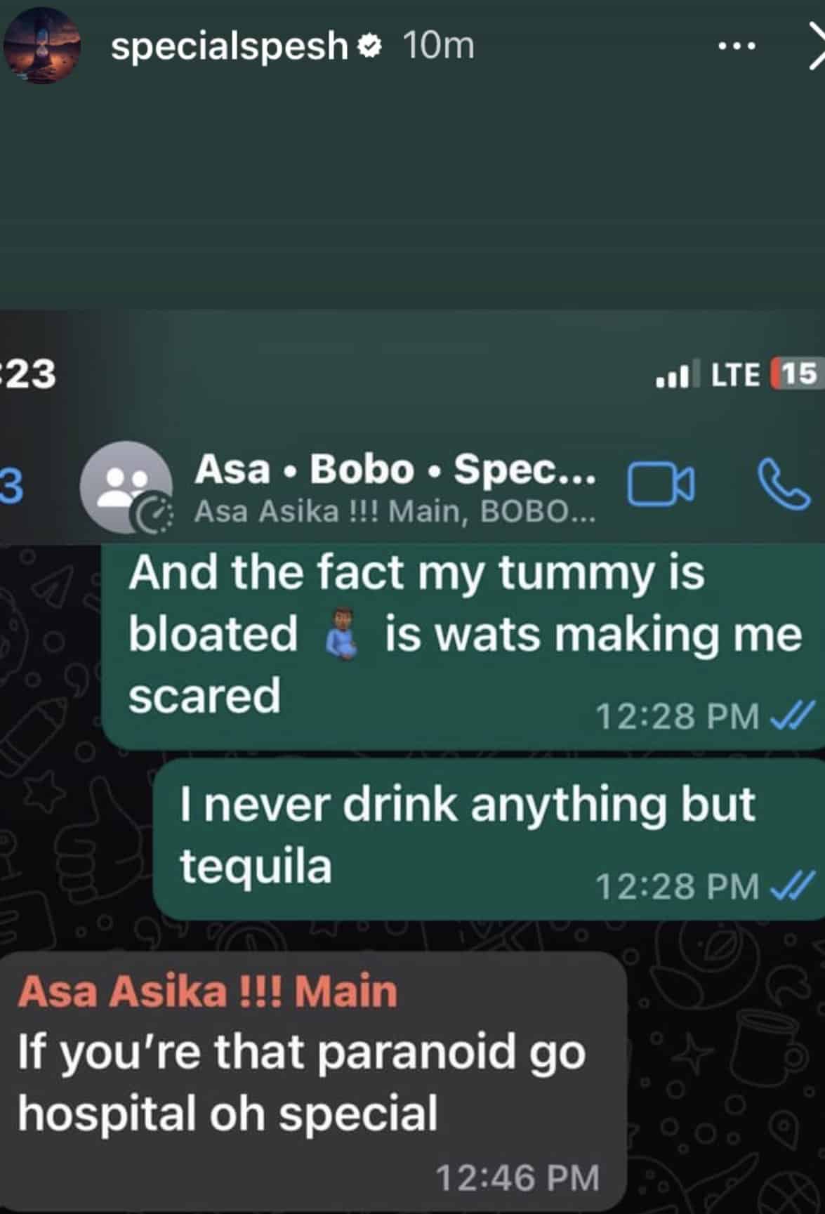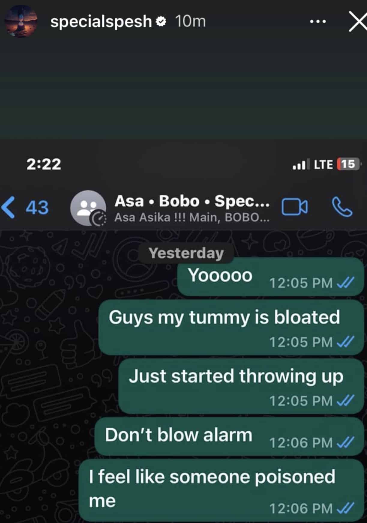 Special Spesh took to their team’s WhatsApp group to lay complaint, noting that he is throwing up and his stomach has become bloated.