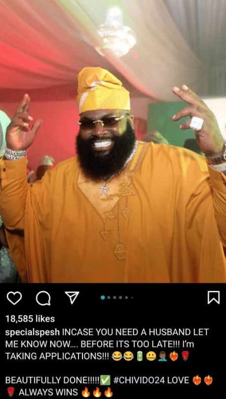 “I’m TAKING APPLICATIONS!!! 😂😂🔋🤐🤦🏾♂️❤️🔥🌹 BEAUTIFULLY DONE!!!!!✅ #CHIVIDO24 LOVE ❤️🔥❤️🔥🌹 ALWAYS WINS 🔥🔥,” Spesh wrote.
