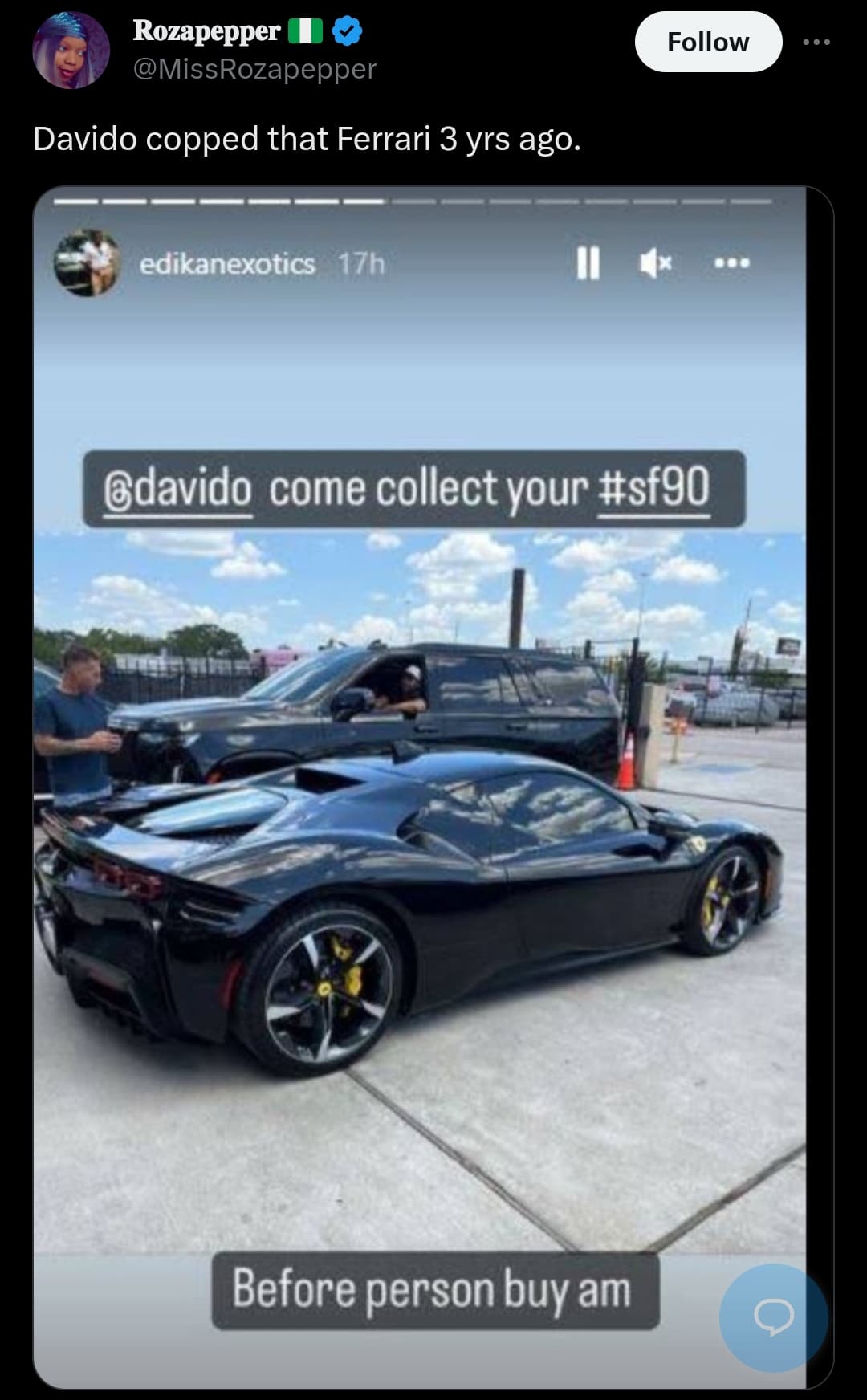 Amid the celebration of Wizkid’s purchase and the ongoing rivalry between fans of both artists, a Davido fan posted a photo of the Ferrari SF90 bought by Davido three years earlier.