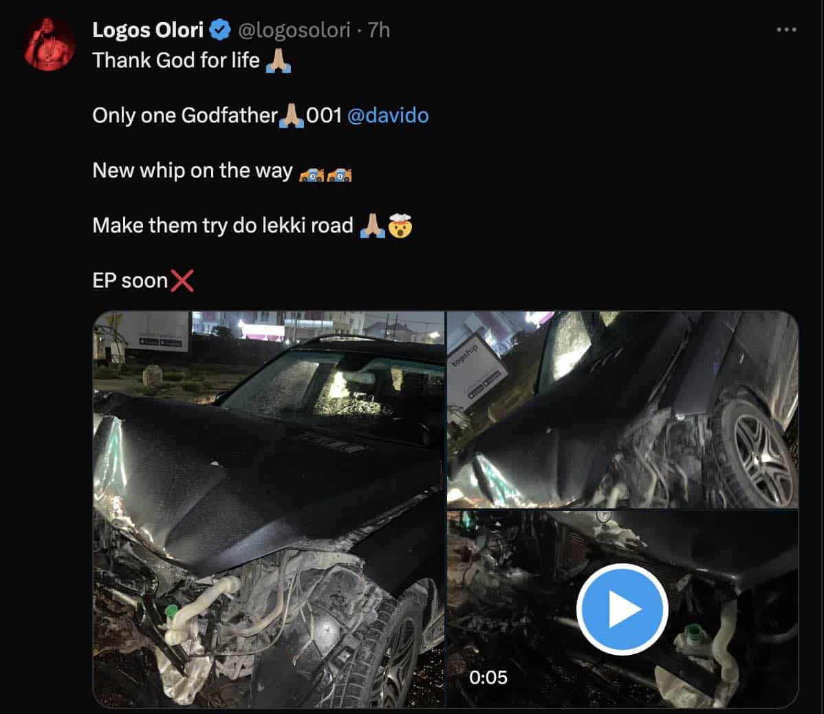 Superstar Afrobeat singer, Davido set to replace the car of his signee, Logos Olori, as he gets involved in a severe accident along the Lekki-Epe expressway, in Lagos.