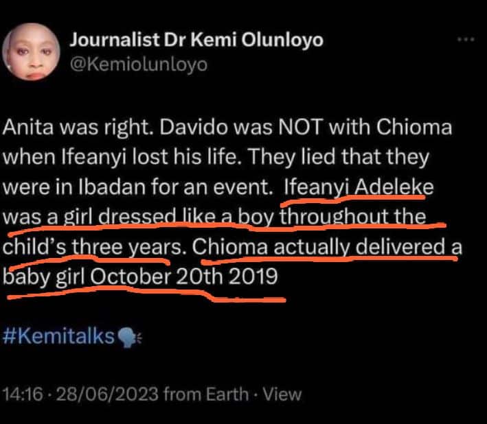 “Anita was right. Davido was NOT with Chioma when Ifeanyi lost his life. They lied that they were in Ibadan for an event. Ifeanyi Adeleke was a girl dressed like a boy throughout the child’s three years. Chioma actually delivered a baby girl October 20th 2019“
