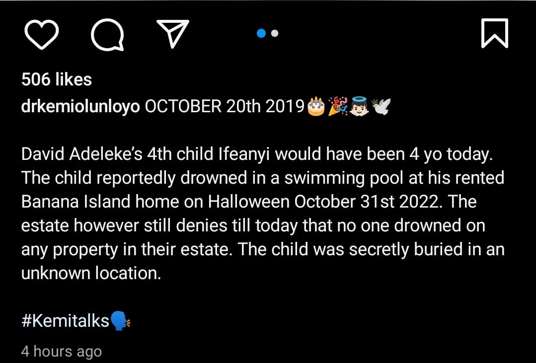 She said: “OCTOBER 20th 2019. David Adeleke’s 4th child Ifeanyi would have been 4 yo today. The child reportedly drowned in a swimming pool at his rented Banana Island home on Halloween October 31st 2022.”