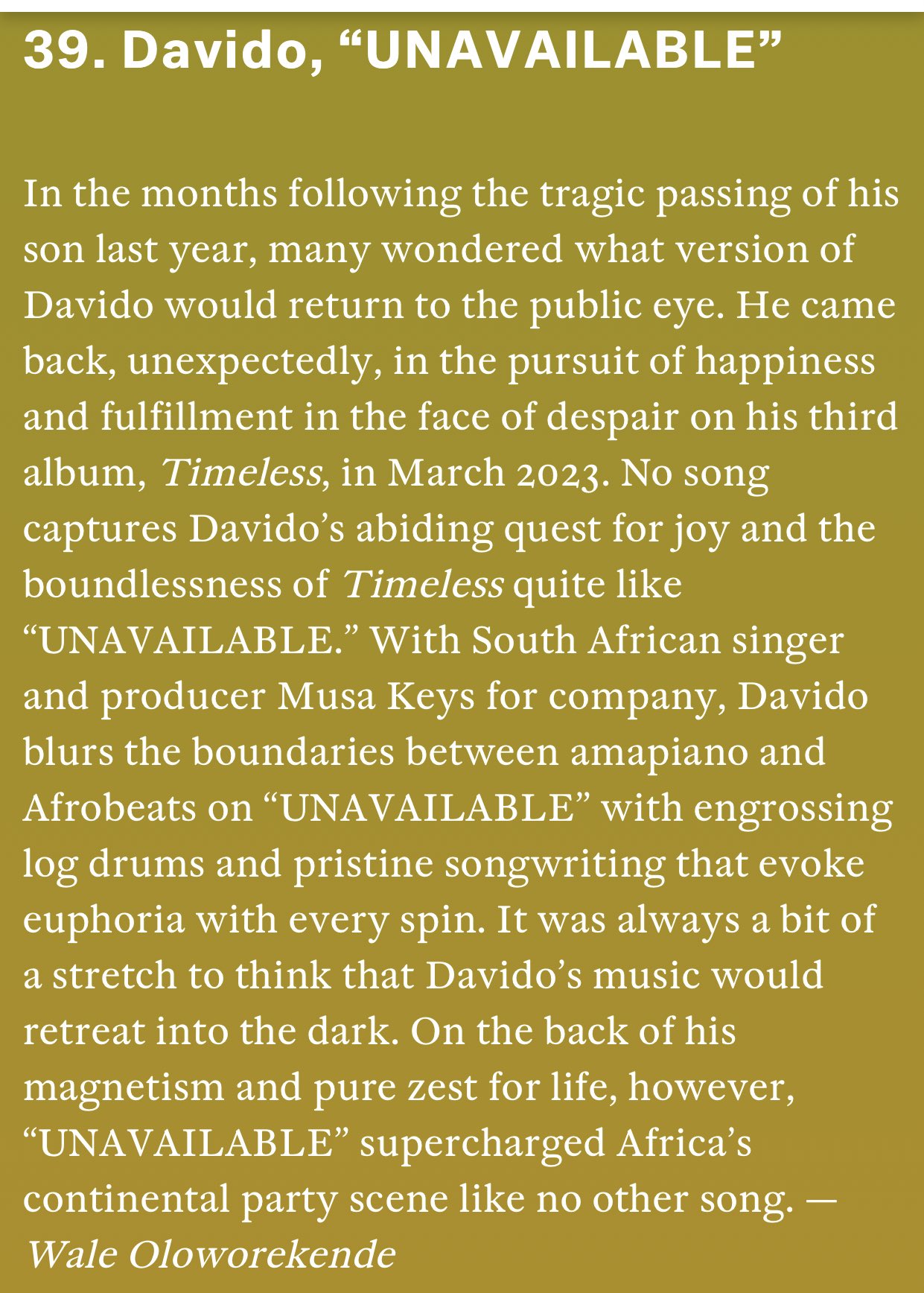 Afrobeat star, Davido‘s “Unavailable” makes it to The Fader Magazine’s “Top 100 Best Songs of 2023”, ranking number 39.