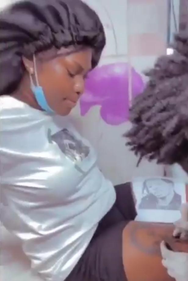 A video shared by Naira Marley shows the lady sitting down, while the tattoo artist did his job on her laps.