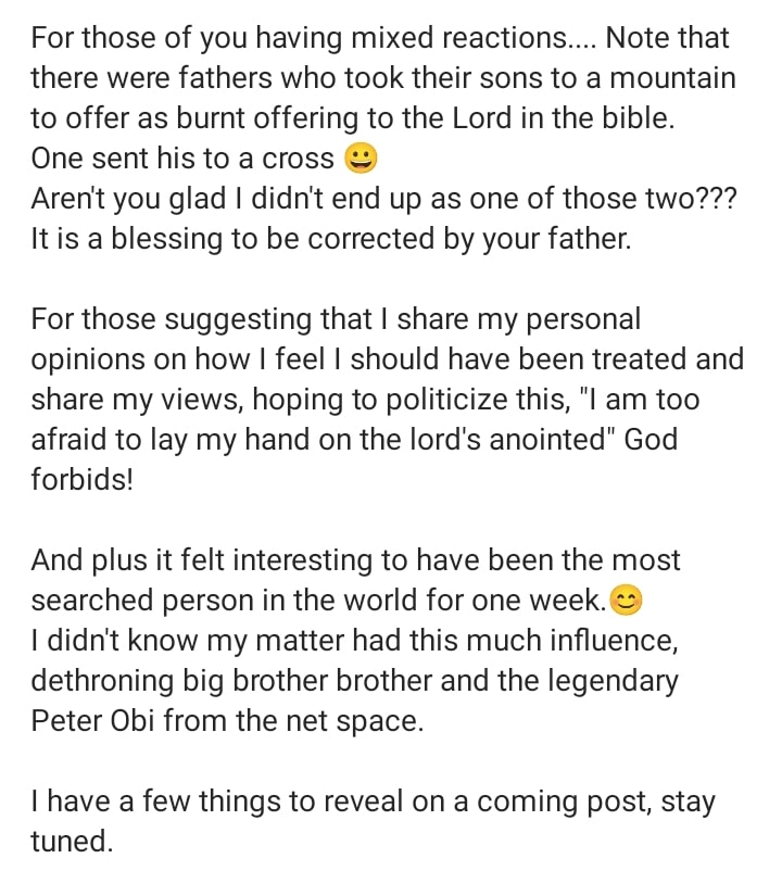 Daysman Oyakhilome breaks silence after being suspended and placed under spiritual rehabilitation by uncle
