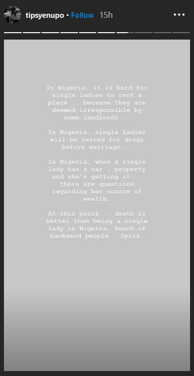 At this point… death is better than being a single lady in Nigeria. Bunch of backward people. Spits”