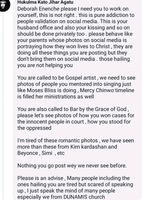 “Deborah Enenche please I need you to work on yourself, this is not right. This is pure addiction to people validation on social media. This is your husband office and also your kissing and so on should be done privately too.
