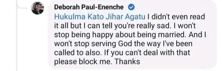 “Hukulma Kato Jihar Agatu I didn’t even read it all but i can tell you’re really sad. I won’t stop being happy about being married. And I won’t stop serving God the way I’ve been Called to also. If you can’t deal with that please block me. Thanks.”