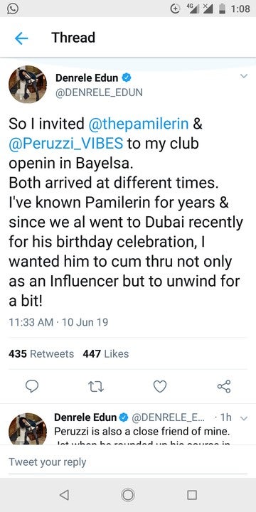 “So I invited @thepamilerin & @Peruzzi_VIBES to my club openin in Bayelsa.