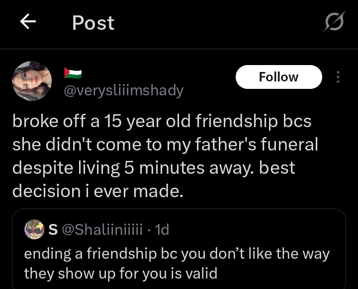 ”Broke off a 15 year old friendship bcs she didn’t come to my father’s funeral despite living 5 minutes away. best decision i ever made. I didn’t explicitly ask her why she didn’t come because it was a pattern. she never showed up for imp days like birthdays or family weddings”, The tweet reads.