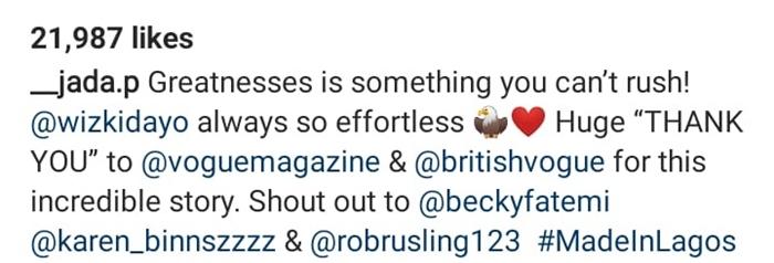 “Greatnesses is something you can’t rush! @wizkidayo always so effortless Huge “THANK YOU” to @voguemagazine @britishvogue for this incredible story. Shout out to @beckyfatemi @karen_binnszzzz & @robrusling123 #MadeInLagos”