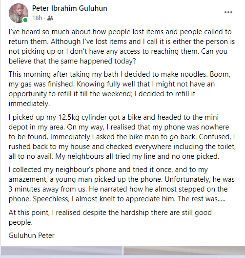 A Nigerian man, Guluhun Peter recounts how a kind-hearted stranger returned his Samsung phone after it went missing.