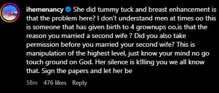 “She did tummy tuck and breast enhancement is that the problem here? I don’t understand men at times oo this is someone who has given birth to 4 grownups oo,is that the reason you married a second wife ? Did you also take permission before you married your second wife? This is manipulation of the highest level, just know your mind no go touch ground on God. Her silence is k!lling you we all know that. Sign the papers and let her be.”