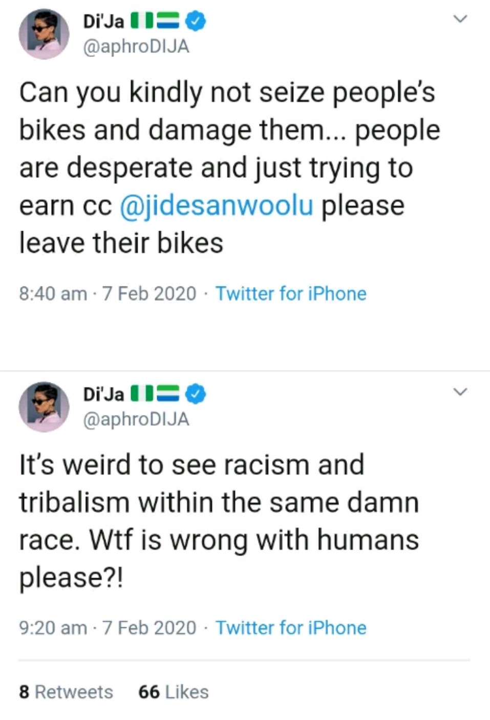 However, with the recent cases of violence recorded, Di’ja has reacted again. She took to her Twitter page to slam the Lagos State governor for seizing and damaging bikes in the state.