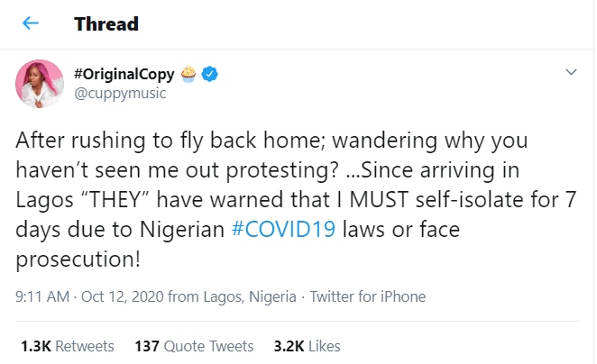 “After rushing to fly back home; wandering why you haven’t seen me out protesting? …Since arriving in Lagos “THEY” have warned that I MUST self-isolate for 7 days due to Nigerian #COVID19 laws or face prosecution!” she tweeted.