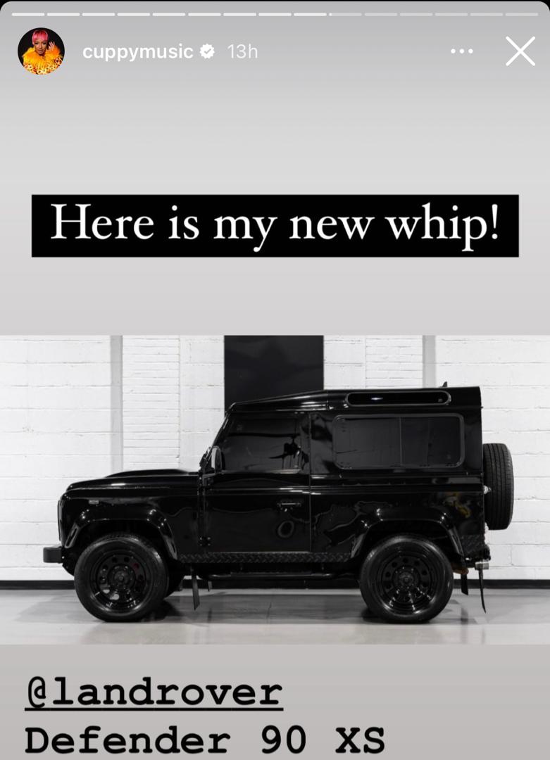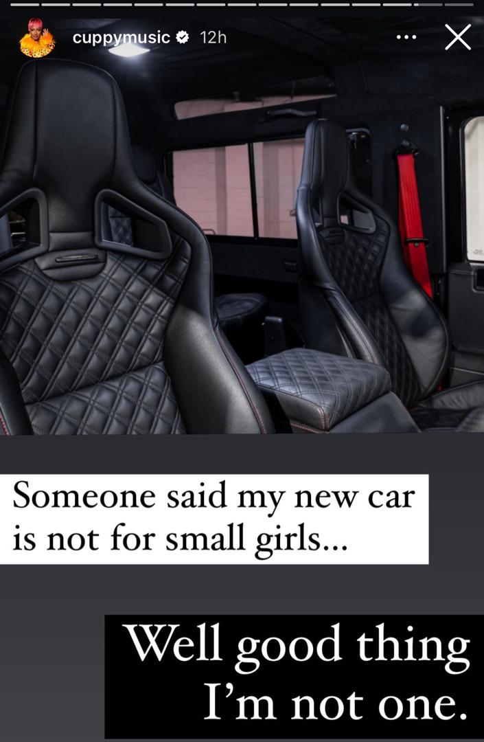 Taking to her Instagram story, Dj Cuppy flaunted the new addition as she gives a short summary of the car’s features and her reason for choosing it.