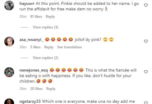 Another user added, “At this point, Pinkie should be added to her name. I go run the affidavit for free make dem no worry🚶🏾”