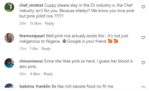 Taking to her Instagram story, Dj Cuppy shared a photo of a pink-coloured plate of jollof rice with steak and potatoes.
