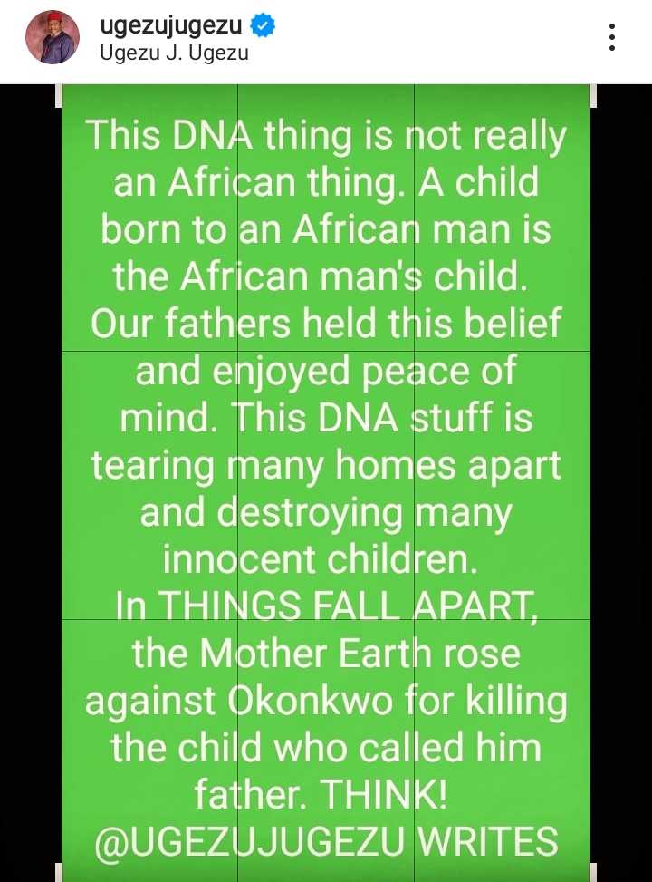 “DNA test isn’t an African thing; a child who calls an African man ‘father’ is an African man’s child” – Ugezu Ugezu says