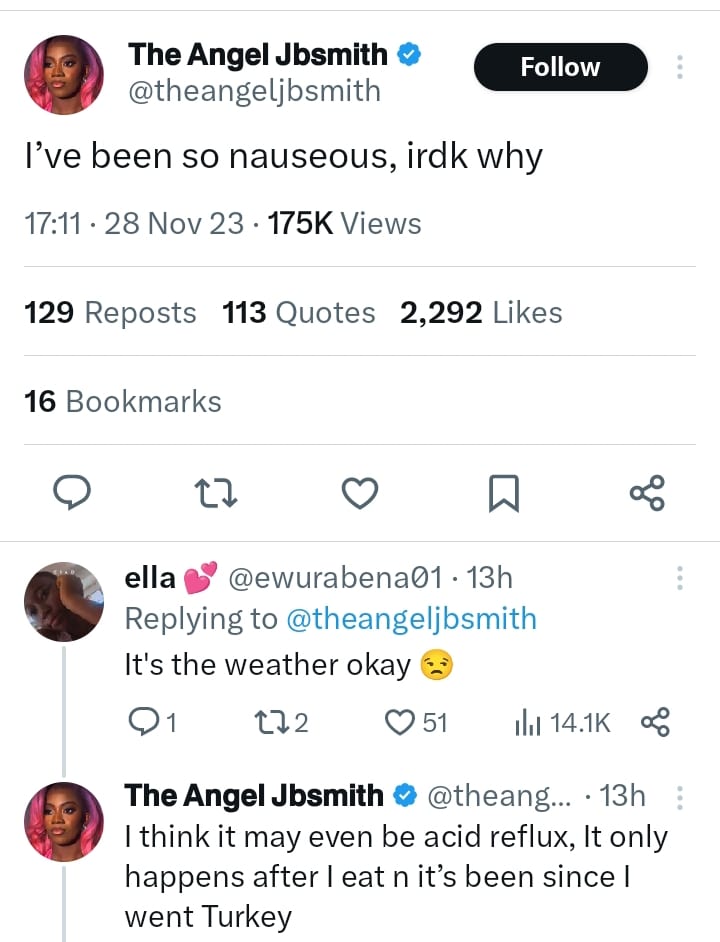 Angel Smith replied: “I think it may even be acid reflux, It only happens after I eat n it’s been since I went Turkey”