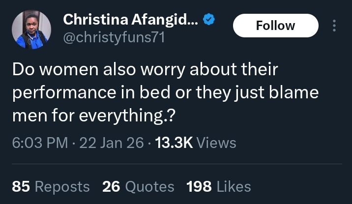 The post, shared on X (formerly Twitter), quickly gained traction as many users weighed in on whether bedroom performance is a shared concern or something women ignore.