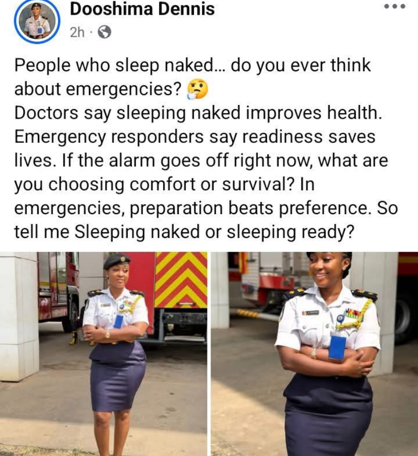 A Nigerian firefighter, Dooshima Dennis, has sparked discussions online after calling out people who prefer to sleep naked, questioning how prepared they are in the event of an emergency.