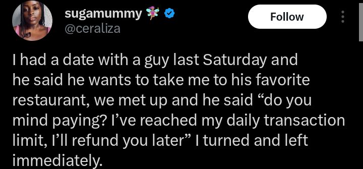 A lady has shared her unusual dating experience online, recounting how a date took an unexpected turn when her companion asked her to cover the bill.