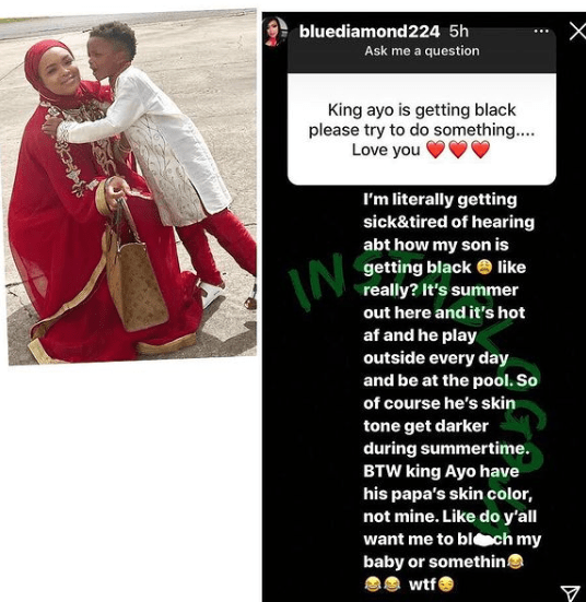 ‘I’m literally getting sick&tired of hearing sat how my son is getting black s like really? It’s summer out here and it’s hot AF and he plays outside every day during summertime, of course, his skin tone getting darker during summertime. BTW king Aye has his pops’ skin color, not mine. Like do y’all want me to bleach my baby or something”?