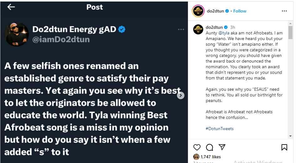 In response to her comment, Do2dtun slammed her for getting an award which didn’t represent her art considering she claimed she represents Amapiano not Afrobeats.
