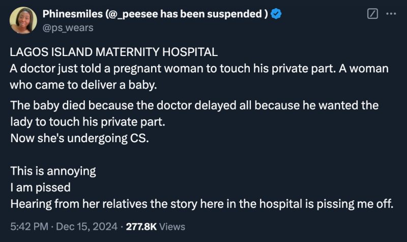 “LAGOS ISLAND MATERNITY HOSPITAL A doctor just told a pregnant woman to touch his private part. A woman who came to deliver a baby,” she stated.