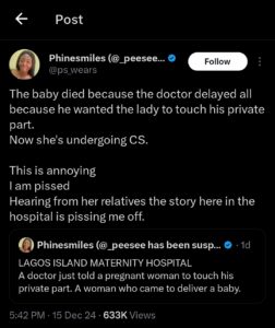 The lady’s statement has sparked outrage online, alleging that at a hospital on Lagos Island, a doctor delayed a woman’s delivery after asking her to touch his private part, which she refused to do.