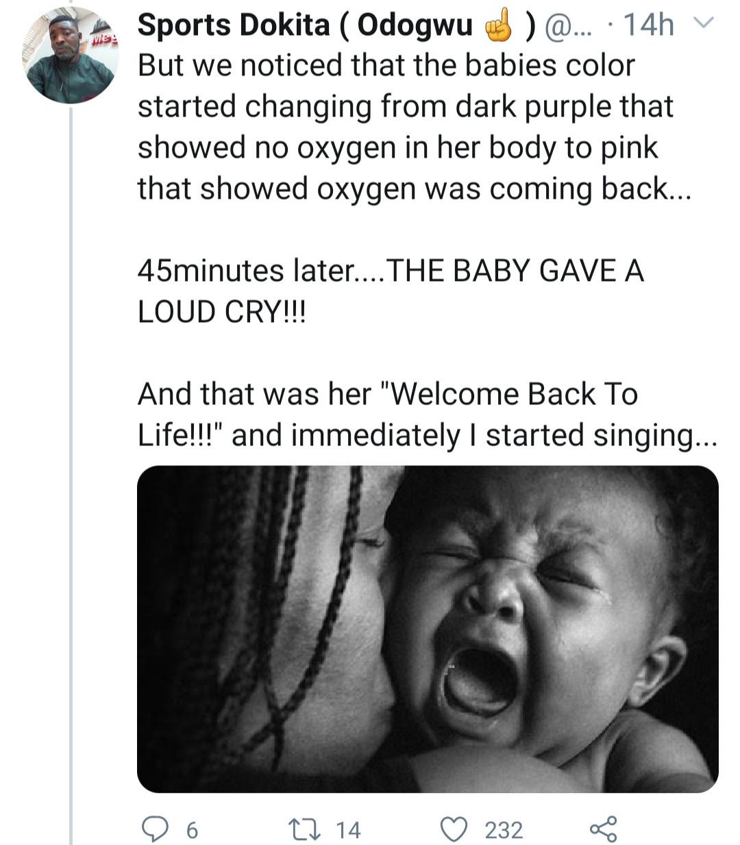 They then transferred her back to the hospital where a CS was done. The baby was “almost dead” when it was brought out, the doctor said. But the nurse on duty refused to give up on the child and kept trying every means to resuscitate the baby.