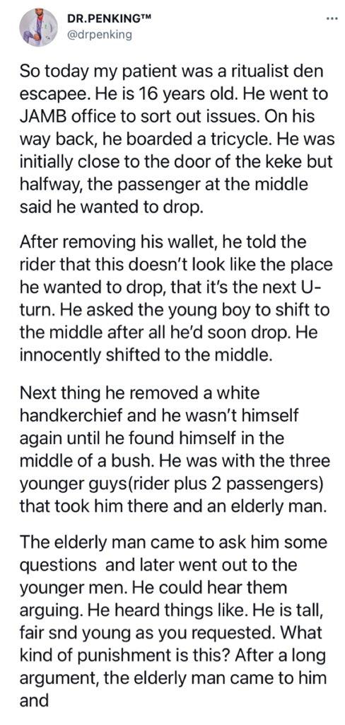 Nigerian doctor identified on Twitter by his handle as @drpenking has taken to social media to narrate how a boy (currently his patient) narrowly escaped from the hands of ritualists.