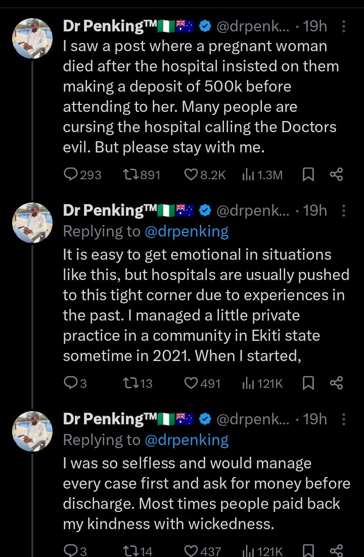 “I saw a post where a pregnant woman died after the hospital insisted on them making a deposit of 500k before attending to her. Many people are cursing the hospital calling the Doctors evil. But please stay with me.