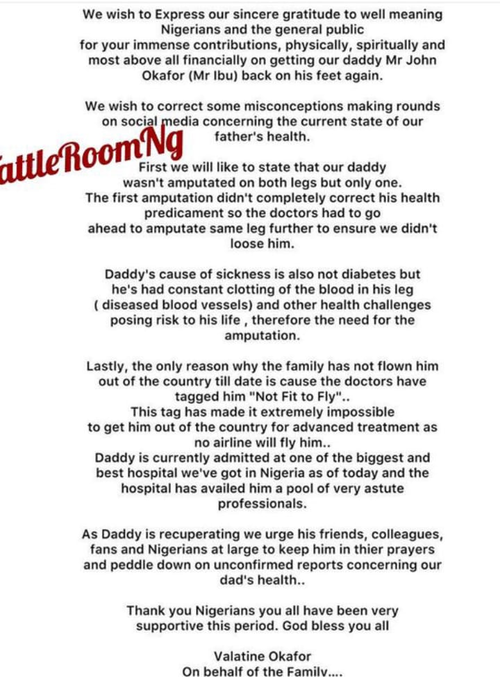 Mr Ibu’s son, Vicent clarified in a statement release on behalf of the family that an amputation was done on same leg, and not another leg being amputated, as is widely thought by the public.