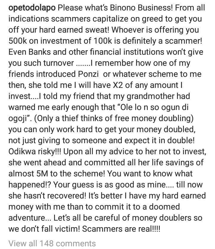 “Please what’s Binono Business! From all indications scammers capitalize on greed to get you off your hard earned sweat! Whoever is offering you 500k on investment of 100k is definitely a scammer! Even Banks and other financial institutions won’t give you such turnover …….I remember how one of my friends introduced Ponzi or whatever scheme to me then, she told me I will have X2 of any amount I invest….I told my friend that my grandmother had warned me early enough that “Ole lo n so ogun di ogoji”. (Only a thief thinks of free money doubling) you can only work hard to get your money doubled, not just giving to someone and expect it in double! Odikwa risky!!! Upon all my advice to her not to invest, she went ahead and committed all her life savings of almost 5M to the scheme! You want to know what happened!? Your guess is as good as mine…. till now she hasn’t recovered! It’s better I have my hard earned money with me than to commit it to a doomed adventure… Let’s all be careful of money doublers so we don’t fall victim! Scammers are real!!!!”