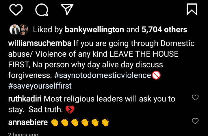 On Instagram, Uchemba wrote: “If you are going through Domestic abuse/ Violence of any kind LEAVE THE HOUSE FIRST, Na person why day alive day discuss forgiveness.”