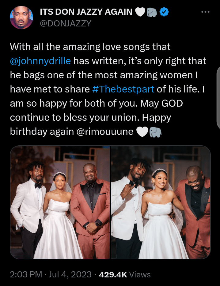 Don Jazzy wrote “With all the amazing love songs that @johnnydrille has written, it’s only right that he bags one of the most amazing women I have met to share #Thebestpart of his life. I am so happy for both of you. May GOD continue to bless your union. Happy birthday again @rimouuune.”