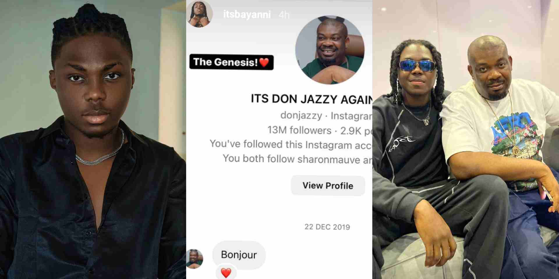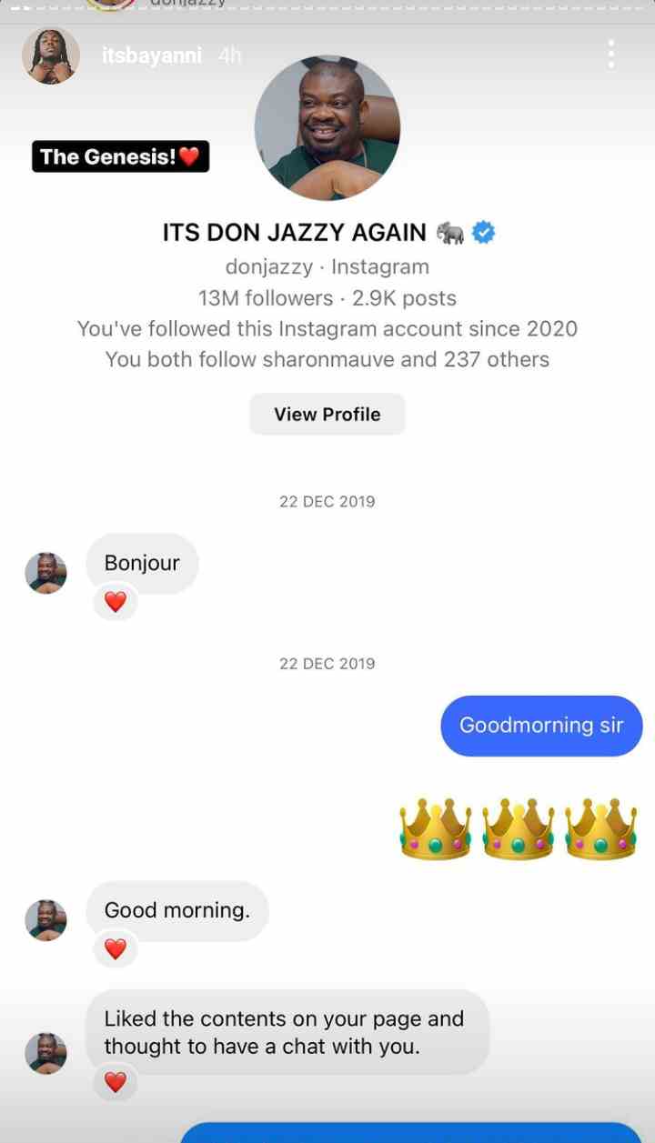 Taking to his Instagram page, Bayanni who claimed that he had been dropping freestyles since 2016 but got a message from Don Jazzy in 2019 that changed his life, chose to roll out a part of the chat.