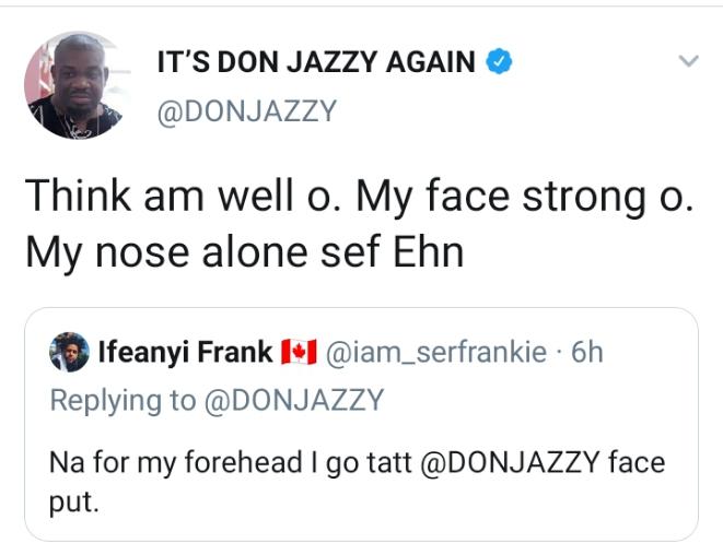 Following this, Serfrankie said he wants to draw a tattoo of Don Jazzy on his forehead, DonJazzy replied;