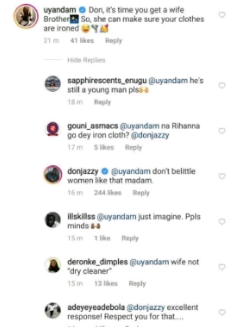 Don Jazzy who rocked a pink T-shirt and his signature trouser in a new photo he shared on Instagram with the caption “Sweet Don”, was asked to find a wife by Uyanda whose comment centered on his “unironed” outfit.