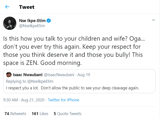 “Is this how you talk to your children and wife? Oga… don’t you ever try this again. Keep your respect for those you think deserve it and those you bully! This space is ZEN. Good morning.” she wrote.