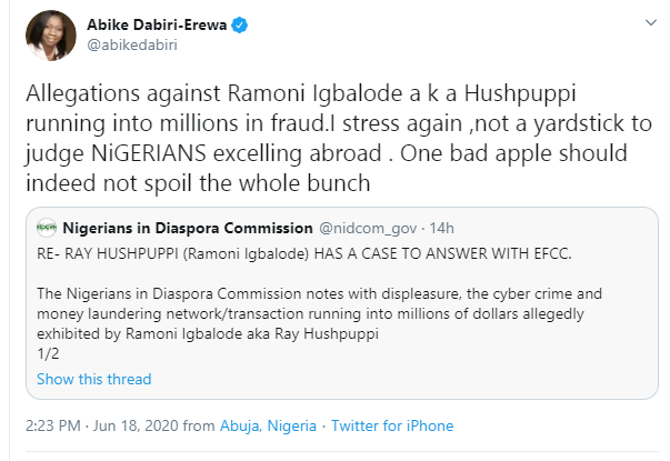 RE- RAY HUSHPUPPI (Ramoni Igbalode) HAS A CASE TO ANSWER WITH EFCC. The Nigerians in Diaspora Commission notes with displeasure, the cyber crime and money laundering network/transaction running into millions of dollars allegedly exhibited by Ramoni Igbalode aka Ray Hushpuppi.
