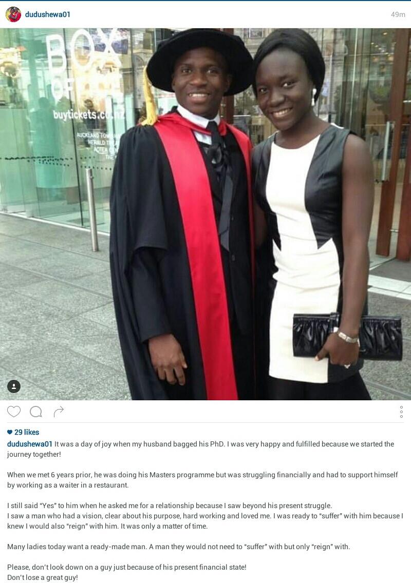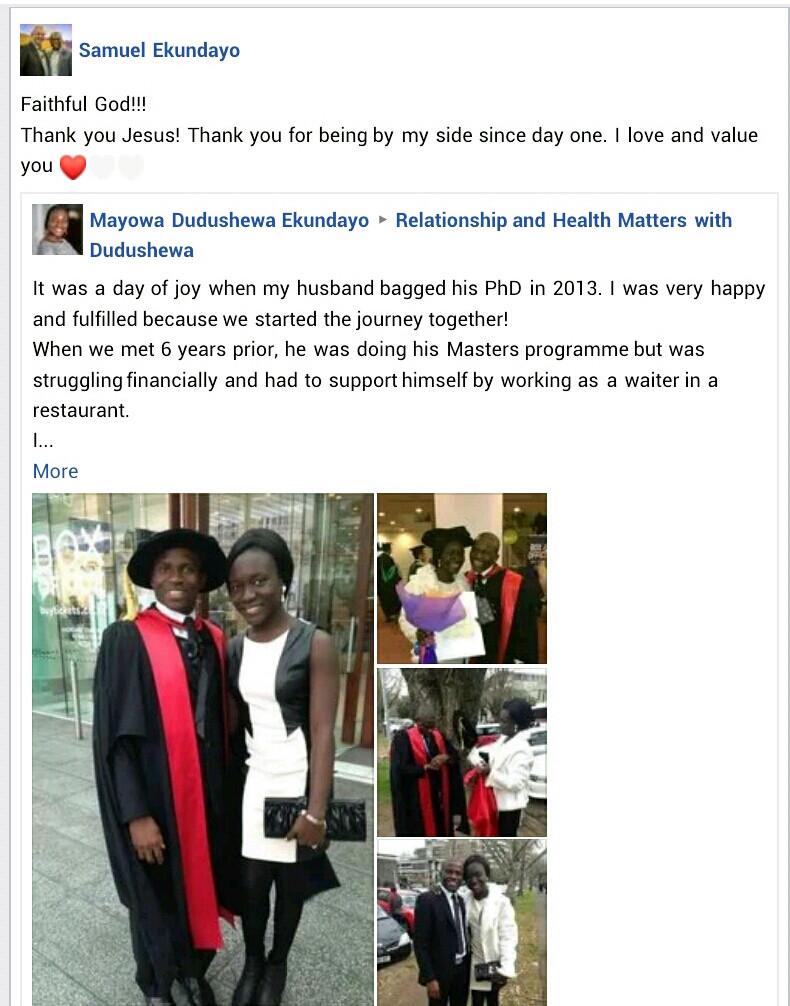 “It was a day of joy when my husband bagged his PhD. I was very happy and fulfilled because we started the journey together!”