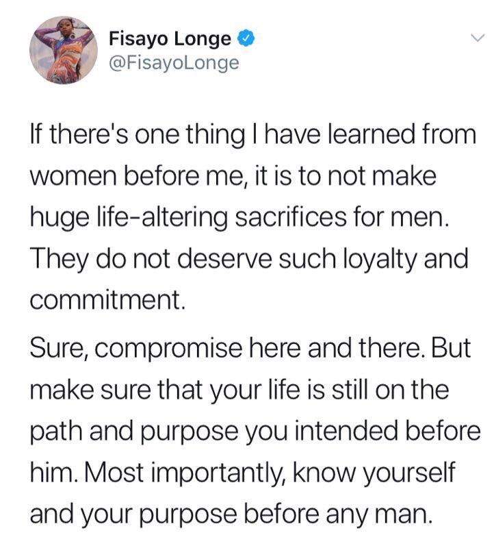 Nigerian designer, Fisayo Longe has cautioned women not to make huge sacrifices for men.
