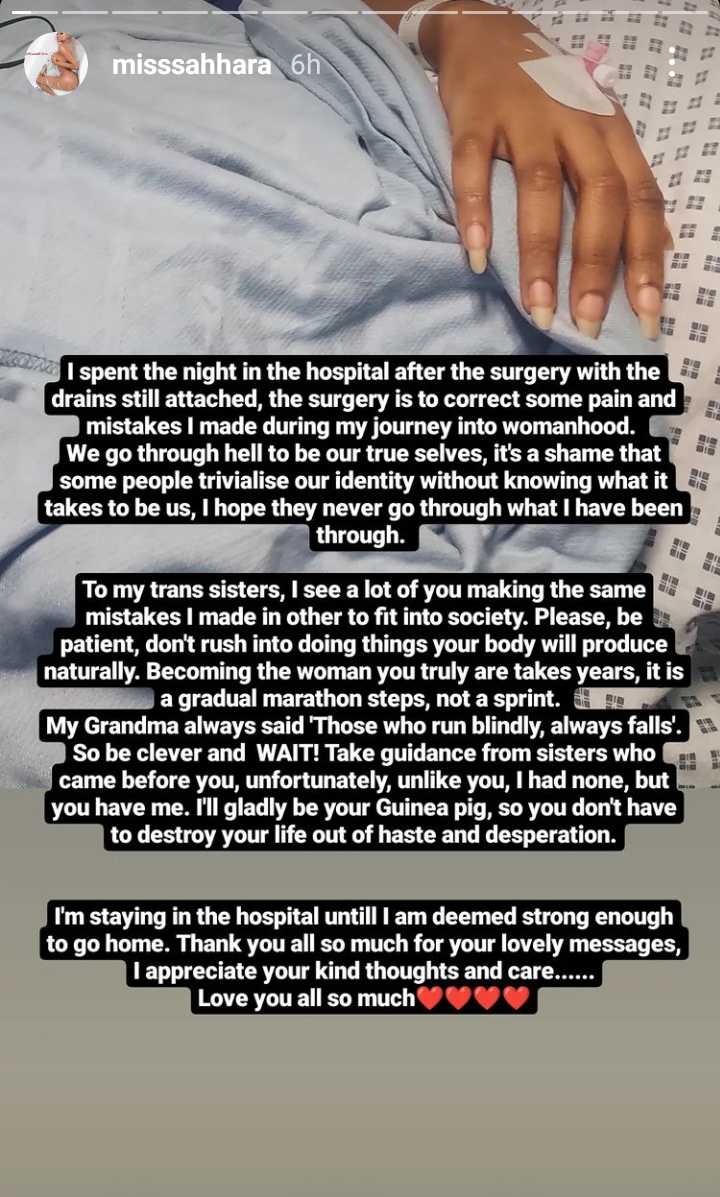 Sahhara shared images of herself on her hospital bed, wishing that they never had to go through what they have, and advising her trans sisters not to make the same mistakes she did because she wanted to fit in.