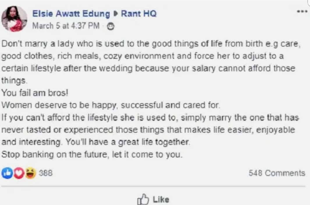 Identified as Elsie Awatt Edung, she took to the Facebook platform to state that men shouldn’t marry a woman accustomed to the good things of life and then force her to adjust to a certain lifestyle.