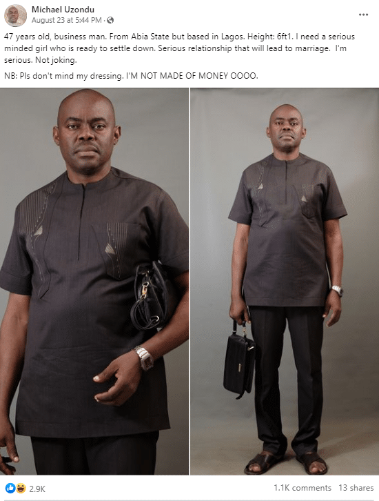 “Don’t mind my dressing” – 47-year-old Nigerian man looking for love advertises self on Facebook